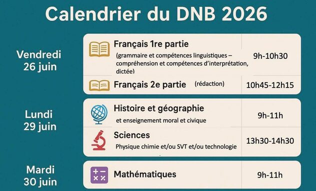 Les épreuves écrites du diplôme national du brevet 2026 communes à tous les candidats auront lieu les vendredi 26 Juin 2026 pour le français, lundi 29 Juin 2026 pour l'Histoire-géographie-EMC et les sciences et mardi 30 Juin 2026 pour les mathématiques.