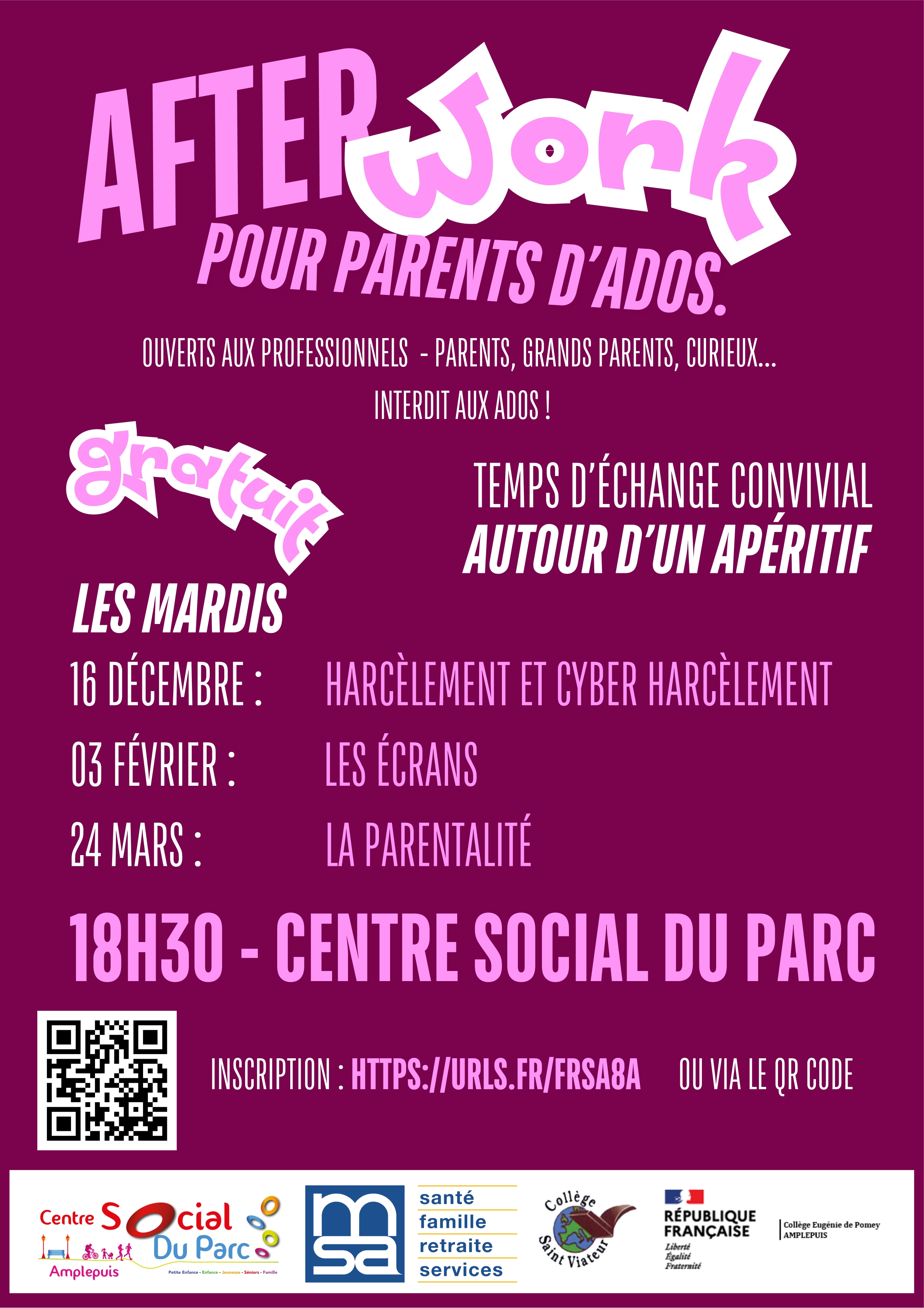 Suite à notre sondage, le Centre Social du Parc a le plaisir de vous inviter à une série de 3 rencontres After Work spécialement dédiées aux parents d’adolescents.